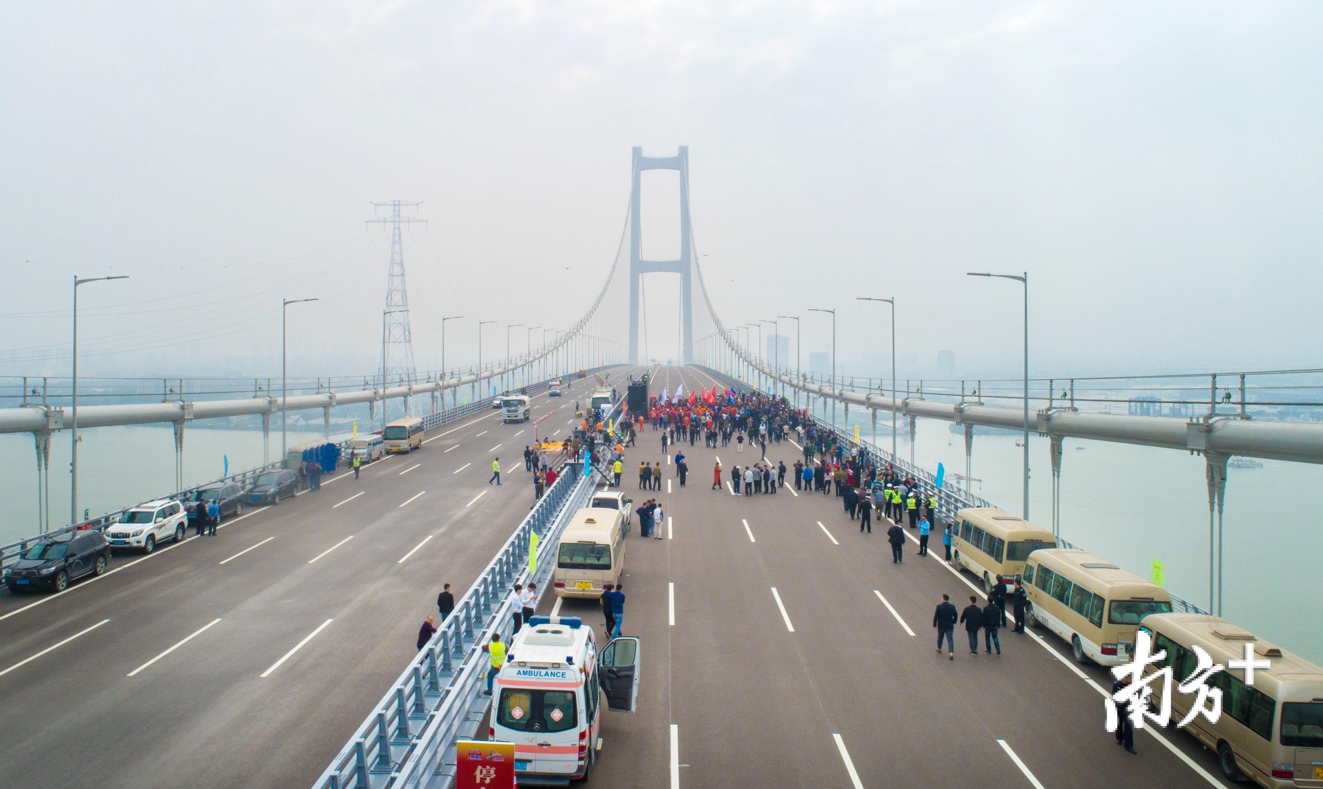 4月2日上午10时许,世界第一跨度钢箱梁悬索桥——南沙大桥(即虎门二桥项目)宣布通车。南方日报记者 肖雄 石磊 郑一见 摄影报道